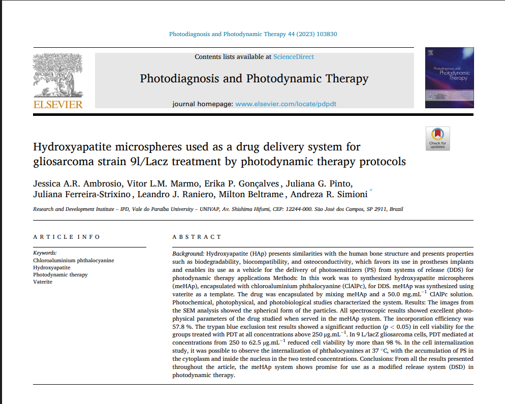 | dc.description.abstract | Background: Hydroxyapatite (HAp) presents similarities with the human bone structure and presents properties such as biodegradability, biocompatibility, and osteoconductivity, which favors its use in prostheses implants and enables its use as a vehicle for the delivery of photosensitizers (PS) from systems of release (DDS) for photodynamic therapy applications Methods: In this work was to synthesized hydroxyapatite microspheres (meHAp), encapsulated with chloroaluminium phthalocyanine (ClAlPc), for DDS. meHAp was synthesized using vaterite as a template. The drug was encapsulated by mixing meHAp and a 50.0 mg.mL− 1 ClAlPc solution. Photochemical, photophysical, and photobiological studies characterized the system. Results: The images from the SEM analysis showed the spherical form of the particles. All spectroscopic results showed excellent photophysical parameters of the drug studied when served in the meHAp system. The incorporation efficiency was 57.8 %. The trypan blue exclusion test results showed a significant reduction (p < 0.05) in cell viability for the groups treated with PDT at all concentrations above 250 μg.mL− 1 . In 9 L/lacZ gliosarcoma cells, PDT mediated at concentrations from 250 to 62.5 µg.mL− 1 reduced cell viability by more than 98 %. In the cell internalization study, it was possible to observe the internalization of phthalocyanines at 37 ◦C, with the accumulation of PS in the cytoplasm and inside the nucleus in the two tested concentrations. Conclusions: From all the results presented throughout the article, the meHAp system shows promise for use as a modified release system (DSD) in photodynamic therapy. | |