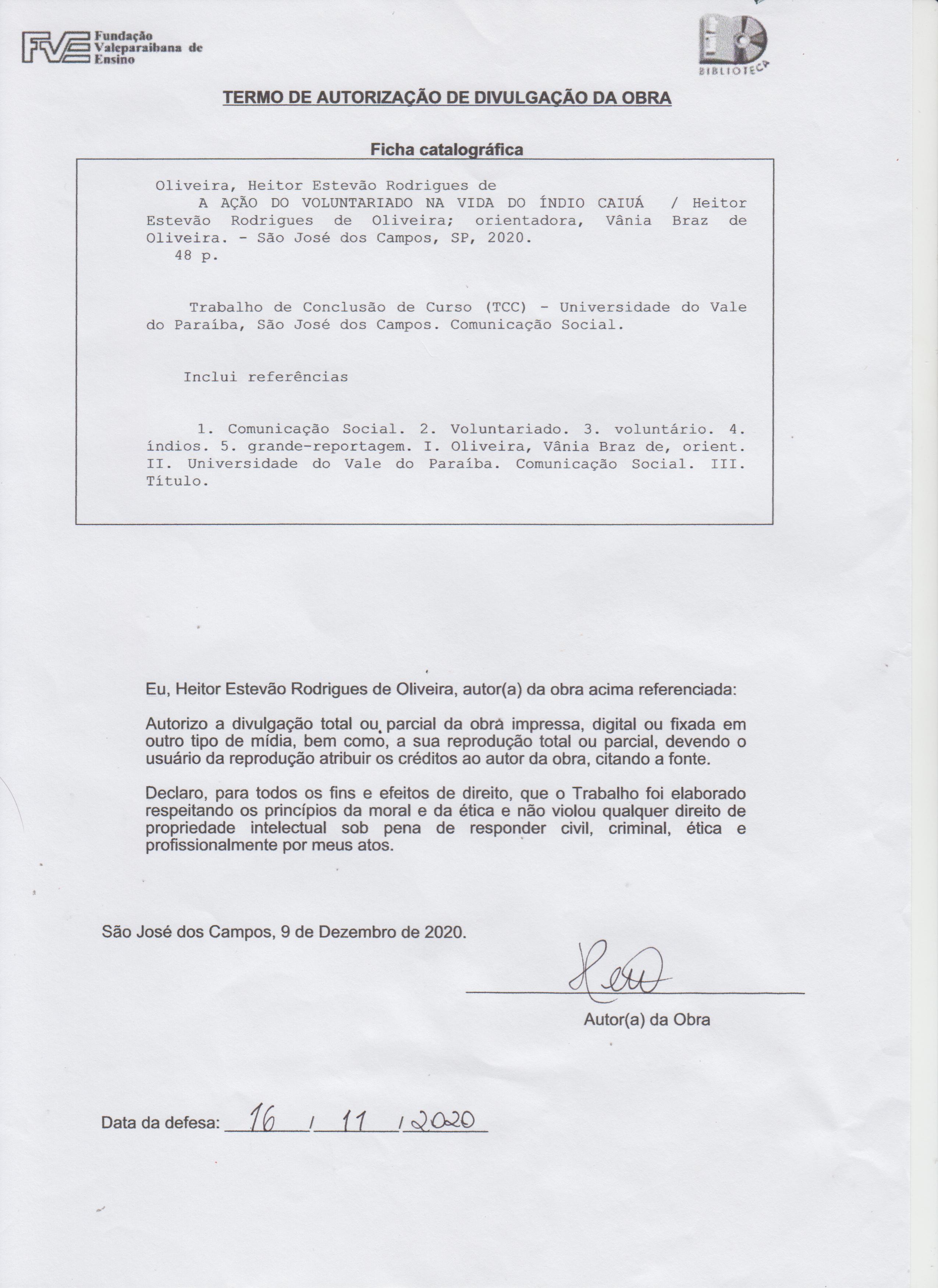 O presente trabalho de conclusão de curso tem como intuito explicitar a importância do trabalho voluntário e da ação social na vida dos indígenas Caiuá, que estão localizados em Dourados, Mato Grosso do Sul, Brasil. Para isso foram feitas pesquisas bibliográfica e documental, a fim de compreender as histórias do voluntariado no Brasil, e ter uma visão geral de como as organizações, Igreja Presbiteriana do Brasil e Mackenzie Voluntário, atuam no auxílio aos índios no país. A grande reportagem narra a história de um índio que teve a sua vida transformada, depois da ação missionária e do voluntariado. É essencial observar e entender o papel como ser humano que pode atuar em ações que agreguem novas perspectivas e benefícios para outras pessoas que vivem em condições precárias e em sua grande maioria desumanas, e como a união de grupos voluntários podem fazer a diferença em tudo isso. O esperado com este trabalho é evidenciar a importância em participar de ações voluntárias e motivar mais pessoas para atuarem nesses projetos.